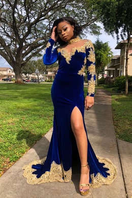 Royal Blue Velvet with Gold Appliques Prom Dress 2025 for Black Girl