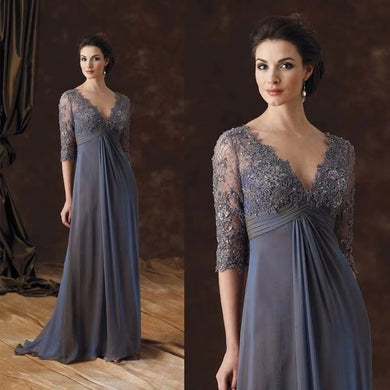 Grey Mother of the Bride Dresses Sequin Lace Appliques Wedding Guest Dress V Neck Chiffon A Line Formal Dress 3/4 Sleeves