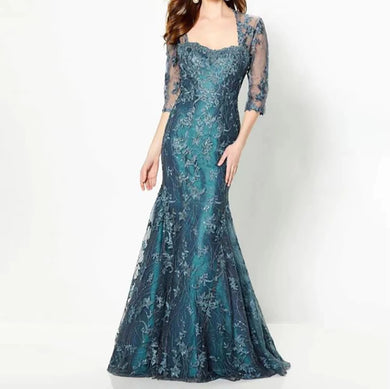Mermaid Mother of the Bride Dresses Lace Tulle Wedding Guest Dress Square Collar Long Formal Dress 3/4 Sleeves