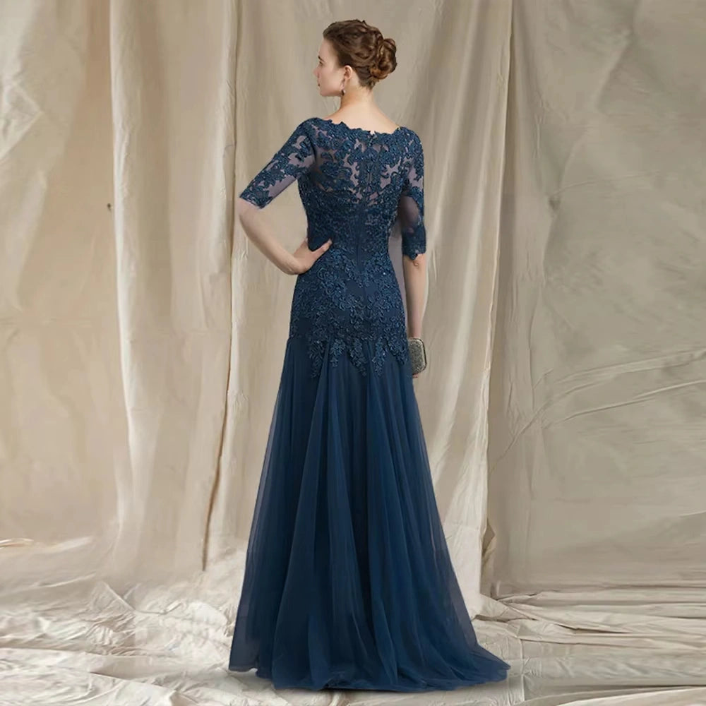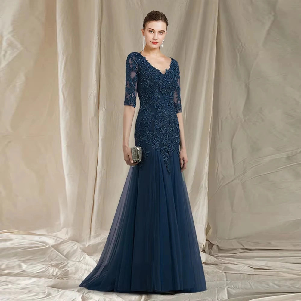 Mermaid Mother of the Bride Dresses Lace Appliques Wedding Guest Dress V Neck Tulle Formal Dress Half Sleeves