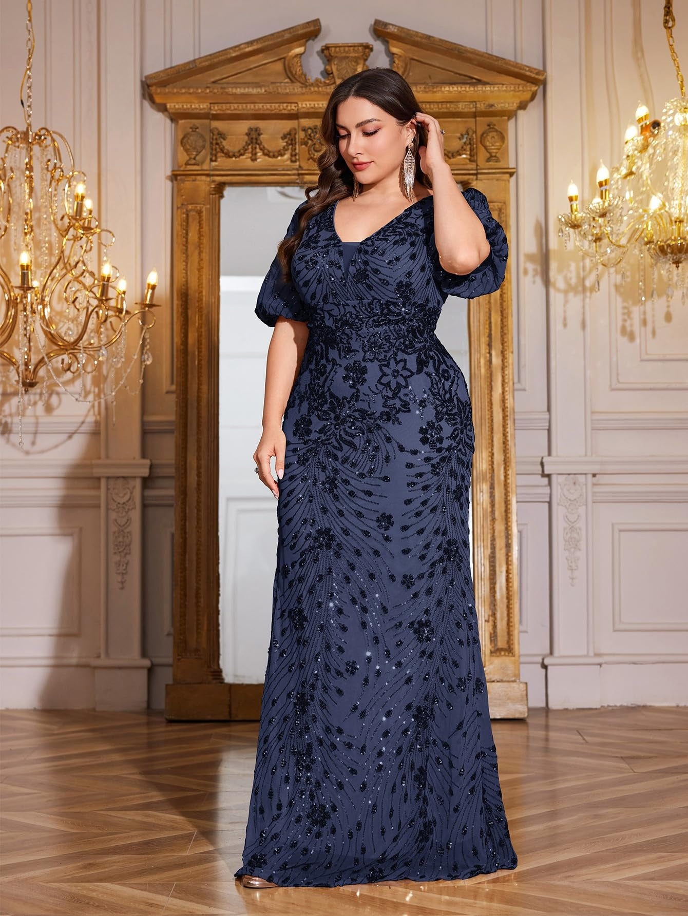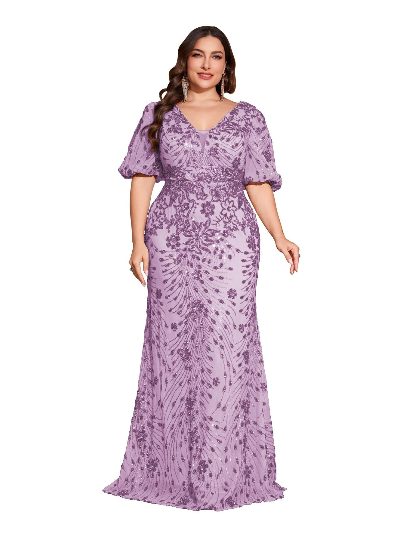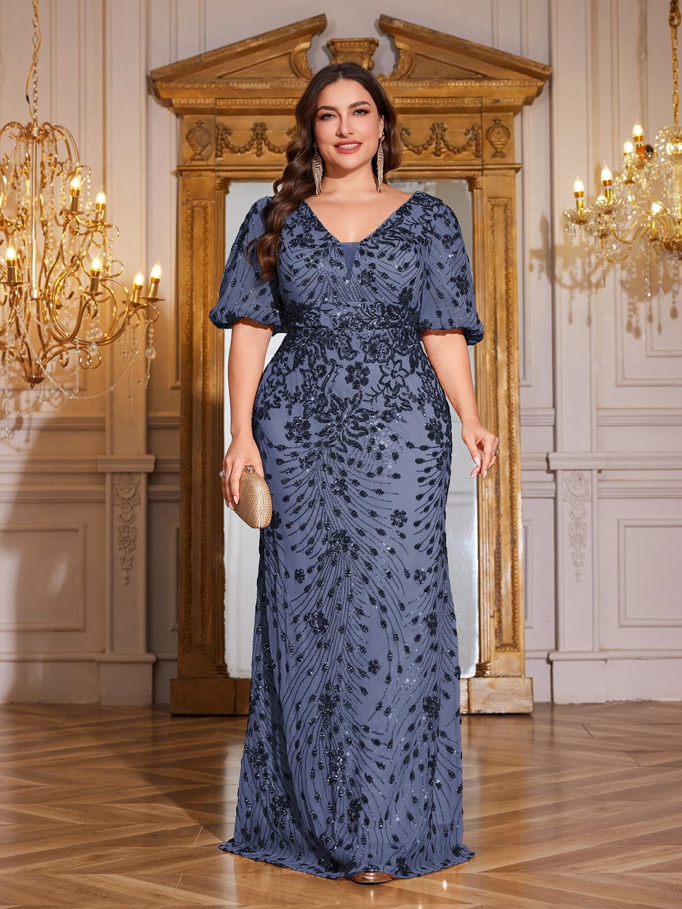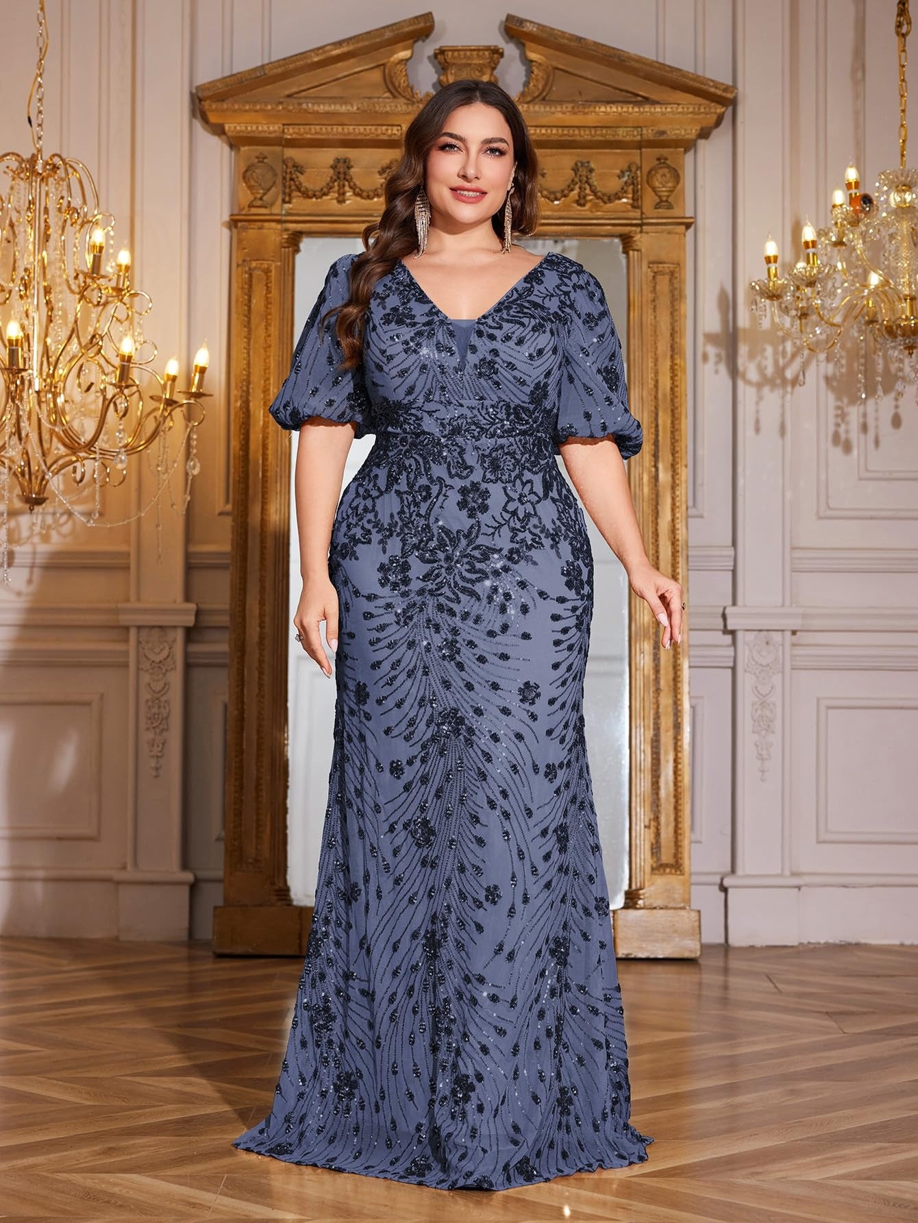 Teal Mermaid Plus Size V Neck Mother of the Bride Dress with Sequin Appliques