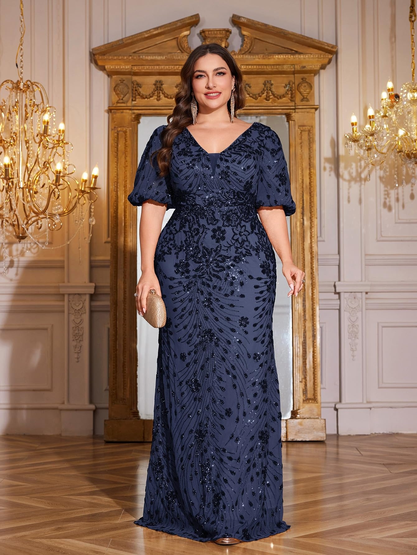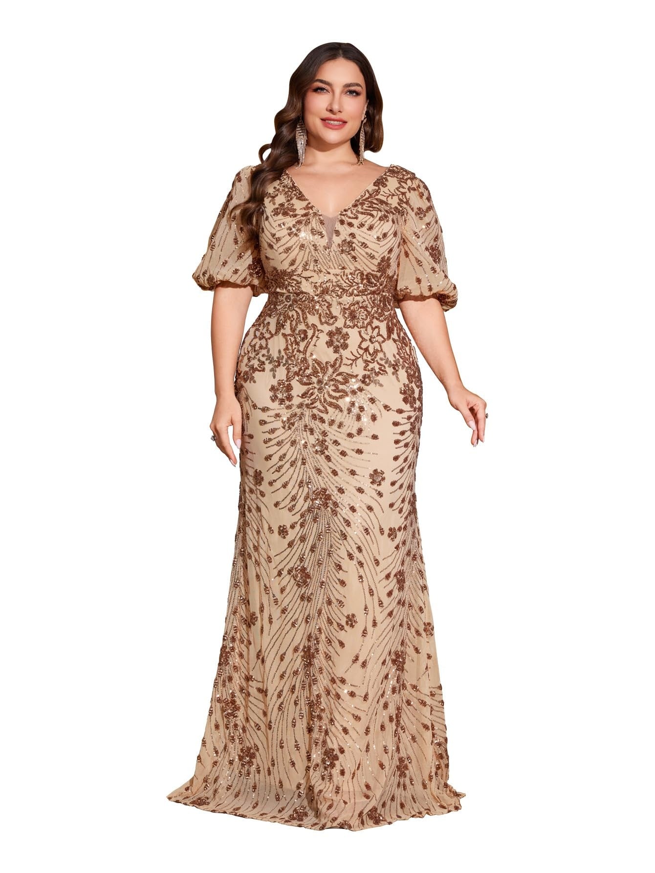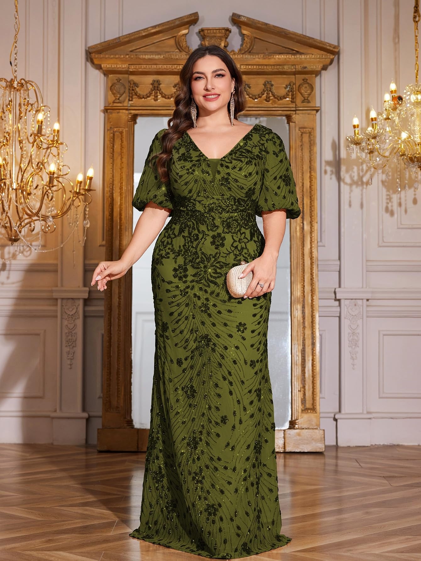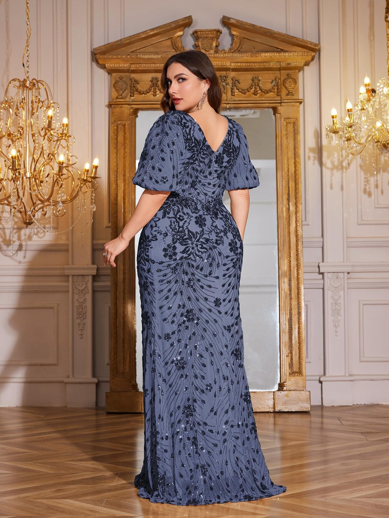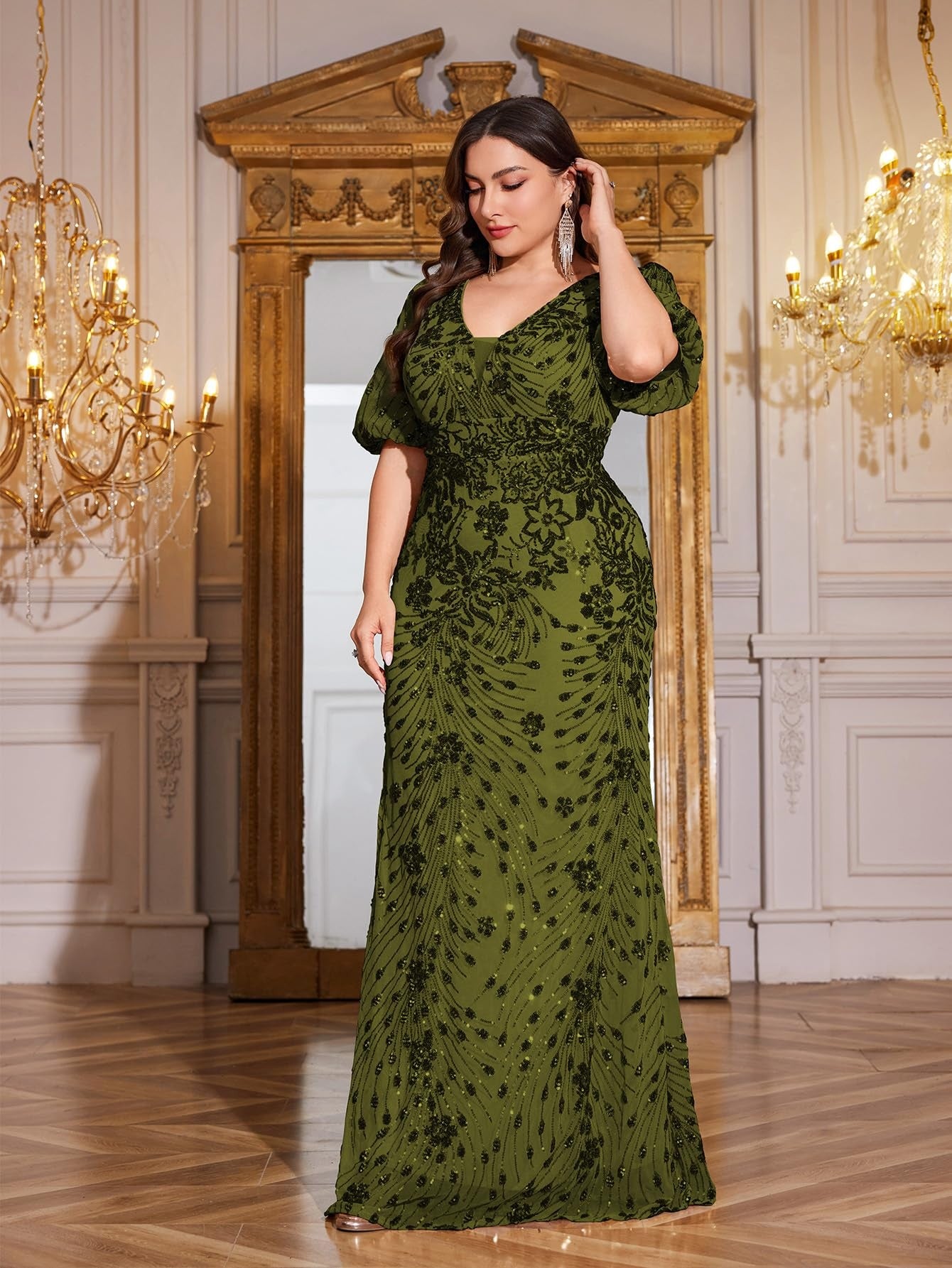 Teal Mermaid Plus Size V Neck Mother of the Bride Dress with Sequin Appliques